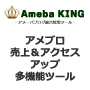 「AmebaKING」アメブロ売上倍増&....1位はAmebaKing。アメブロ管理ツールの中でも多数の機能数と、不具合が少ないツールとして人気。複数のアメブロアカウント管理はもちろん、属性ID抽出や自動ペタ・自動アメンバー申請・全自動読者登録・自動メッセージ送信・自動なうフォロー・自動コメント周り・ビジネステンプレート自動生成・記事投稿機能・同時つぶやき(twitter/なう/mixi)など集客効果もバツグン!