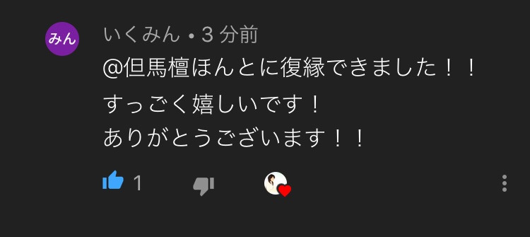 復縁のご報告!!!!!● 復縁のご報告!!!!!こんにちは、但馬檀です。気づけば11月ですね。ふと見ると、YouTubeへのコメントが結構溜まってまして。あれれーお返事をしていたら、速攻お返事くださった方がいらっしゃいました。本当に復縁できました!!すっごく嬉しいです!ありがとうございます!!きゃーおめでとうございます㊗️🍾🍾🎊彼女は無料のこちらを受けました♪-----