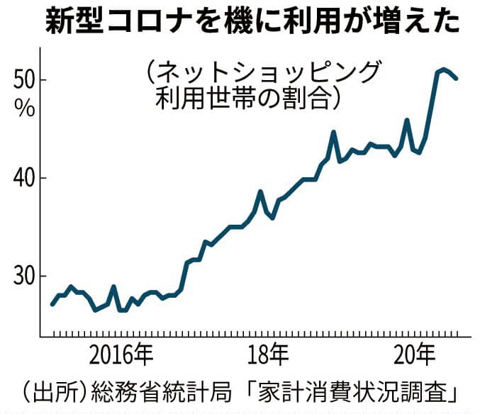 総務省の家計消費状況調査(2人以上の世帯)によると、ネットショッピングを利用する世帯の割合は5月に51%と初めて5割を超えた。その後も5割以上をキープし、直近公表の8月調査でも50%と2014年の年間平均(25%)から倍増し、19年平均(43%)比でも7ポイント上昇している。