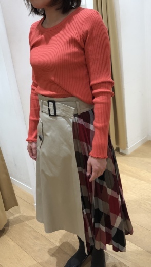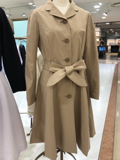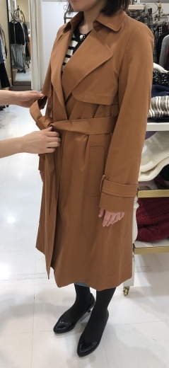 さらりと羽織ったり、共布ベルトでウエストマークしてアレンジし着用できるテラコッタカラーのコート。ベージュ系が多い中で、新鮮なカラーでお似合いでした。