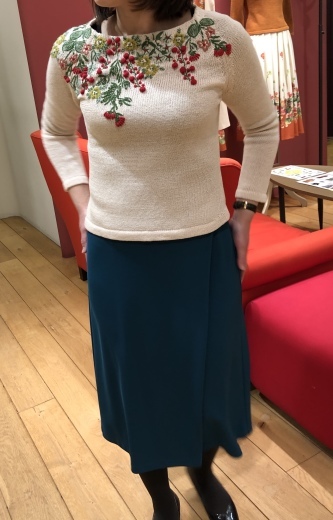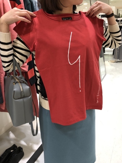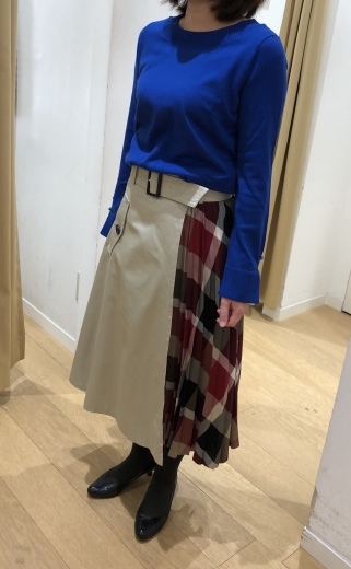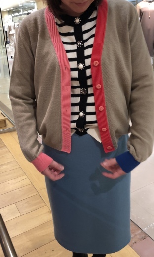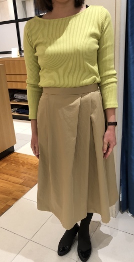 今回一押しのサマーニットです。流行りのアシンメトリーのスカートにインして女子大生のように若々しく素敵でした。