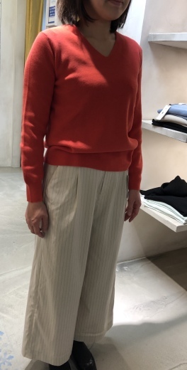 ベストカラーのオレンジ色のセーターと柔らか素材のワイドパンツ。