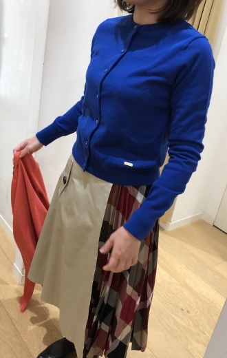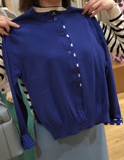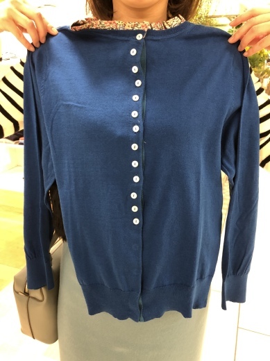 ブルーのカーディガンは袖口や前立てのデザインが可愛い。