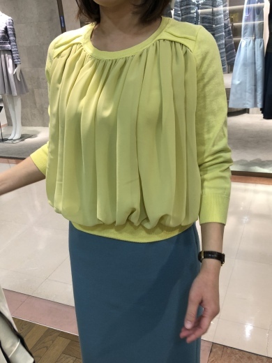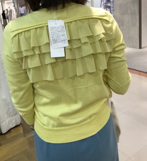 この柔らかいイエローのトップスは、前にも後ろにも可愛いシフォン素材が使ってあって、すごくエレガントで可愛いのですが、抱っこが多い子育てママには使いづらいかな〜