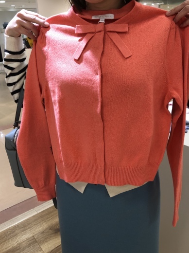 短めな丈のサーモンピンクやコーラルピンクのカーディガン。