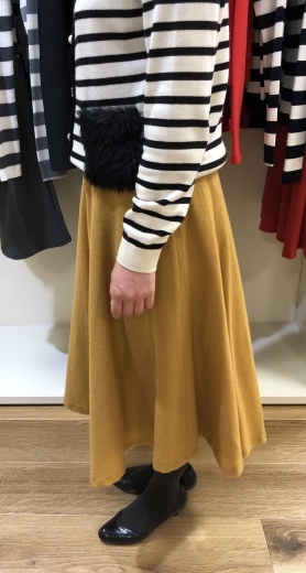 きれいなラインが出るフレアースカートは、赤もマスタードも素敵。