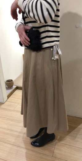 麻とポリエステルのフレアースカートは、定番のベージュで合わせやすいアイテムです。