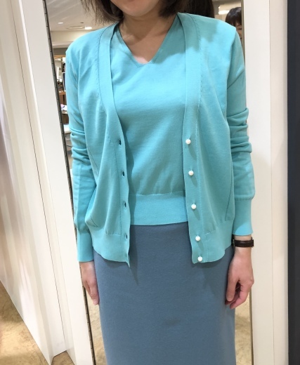 アクアブルーのツインニットは、Sさんには少し寂しい印象に。