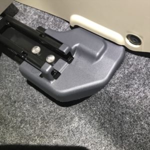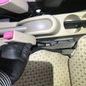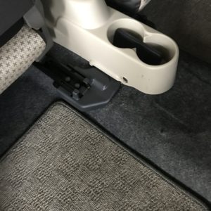 シートレールカバーを外してみると・・・ご覧のように挟まってました。また、このお車はセンターコンソールが簡単にネジが外れるので、ちょっと持ち上げといて除去しクリーニングすることに