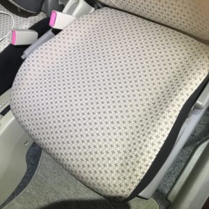〈施工前〉 分かりますかね~~~!?背もたれに薄っすらと嘔吐のシミが残ってます。自分で嘔吐物は取り除き拭き掃除をしたとお聞きしましたが・・・仮にネットでよく見かけるファ・・ズとかや重曹を使ってみても、この嘔吐臭は残念ながら取れませんので、お任せ下さい