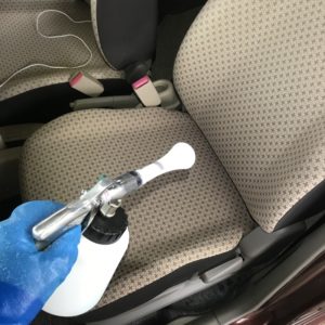 本日は先日『具合が急に悪くなって助手席シートを倒していたお子さんがそのまま吐いてしまい、自分で掃除しても臭いが取れないという事で消臭施工』しましたので、ご紹介します。ご依頼は、茨城県水戸市のお客様からで、当日朝お電話いただいて、予約が入ってなかったので直ぐに向かってお昼に施工させていただきました~~~~~