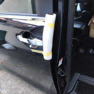 〈施工の様子〉 ドアを全開すると駐車場のブロック塀に当たりそうなので、ドアを柔らかいスポンジでカバーします