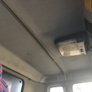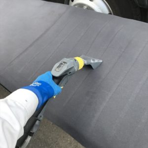 〈施工の様子〉 天井は運転席側半分クリーニングを終えました。汚れてないようでもご覧の通りです