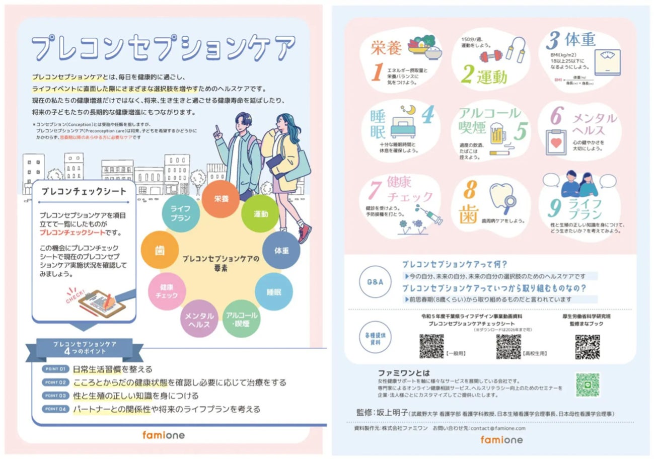 ファミワンが2024年8月28日に実施した自治体保健師向け勉強会において、「20〜30代向けのプレコンセプションケアの啓発チラシが欲しい」「プレコンセプションケアについて、冊子ではなくA4用紙1枚でまとまっているものが欲しい」といったご要望がありました。それを受け今回ファミワンでは、坂上明子先生の監修の元、プレコンセプションケアの啓発に関する資料を作成し無料で公開することを決定しました。