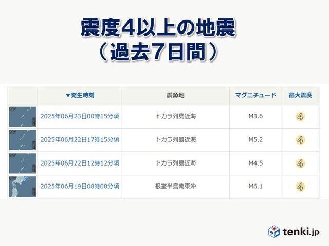 6月16日午前6時から23日午前6時までの1週間で、地震が観測されたのは195回。そのうち、震度3以上の地震が15回、震度4を観測した地震は4回発生しています。 19日には、根室半島南東沖を震源とするマグニチュード6.1の地震が発生し、北海道釧路町で震度4を観測しました。また、昨日22日から今朝23日にかけては、トカラ列島近海を震源とする地震が多発しており、最大震度4の地震が3回発生しています。 地震は、いつ発生するかわかりません。家具の固定やハザードマップ・避難所・非常用のグッズの確認など、日頃から備えをしておきましょう。