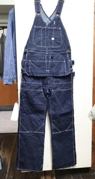 ベースには40年代のリー社のオーバーオールをベースにして、上部についているビブポケットにはスナップボタンにペン差しポケットにクッシュマンネームプレートが付けられ、特徴のあるエプロンポケットとさらにはその下にもポケットが配され、その他ツールポケットに3か所のハンマーループが付いたダブルニー仕様の50‘snのワークオーバーオールになります。ワンウォッシュ済です。
