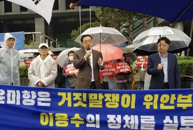 accompanied by Peace and Human Rights Party leader Choi Yong San, held a press conference to denounce Yoon Mee-hyang, saying that "We, the victims of the Japanese Empire, will continue our resignation activities until Yoon Mee-hyang resigns as a member of the National Assembly" and "We are demanding reparations and apologies from Japan, but the Korean Council is opposed to everything about Japan".