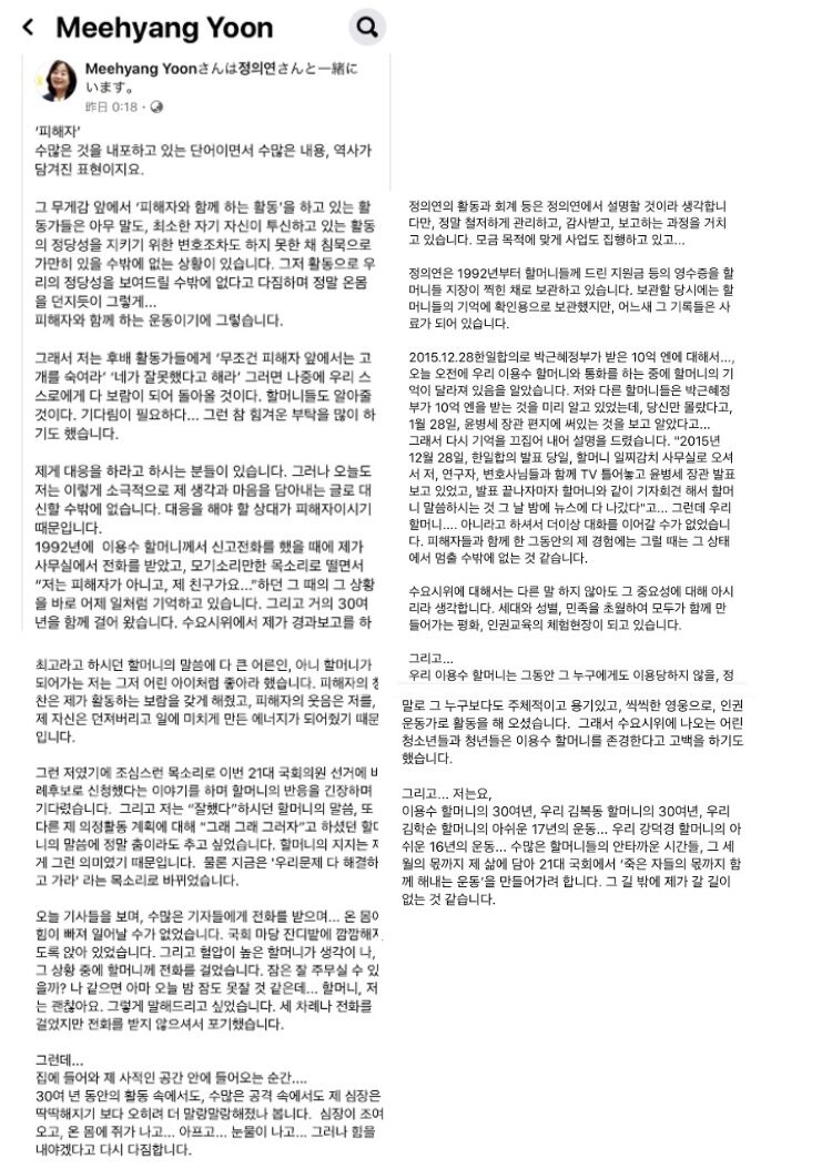 (4) In response to accusations from Lee Yong-soon, a former leader of the Korean Council, Yoon Mee-hyang posted a comment that denies the fact that Lee Yong-soon was a former comfort woman on her own Facebook that "I vividly remember the day in 1992 when I received a phone call from Lee Yong-soo, and in a small, trembling voice, she confessed the comfort women victimization, not as a story of herself, but as her friend's".