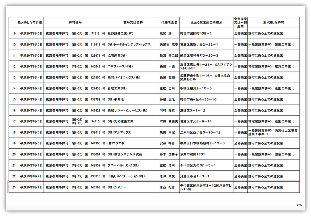 ・掲載されている建設業者には,一部廃業した業者(建設業許可の28業種のうち,一部の業種について許可要件を欠いた業者)も含まれます。したがって,取り消していない許可業種については引続き許可を有しています。