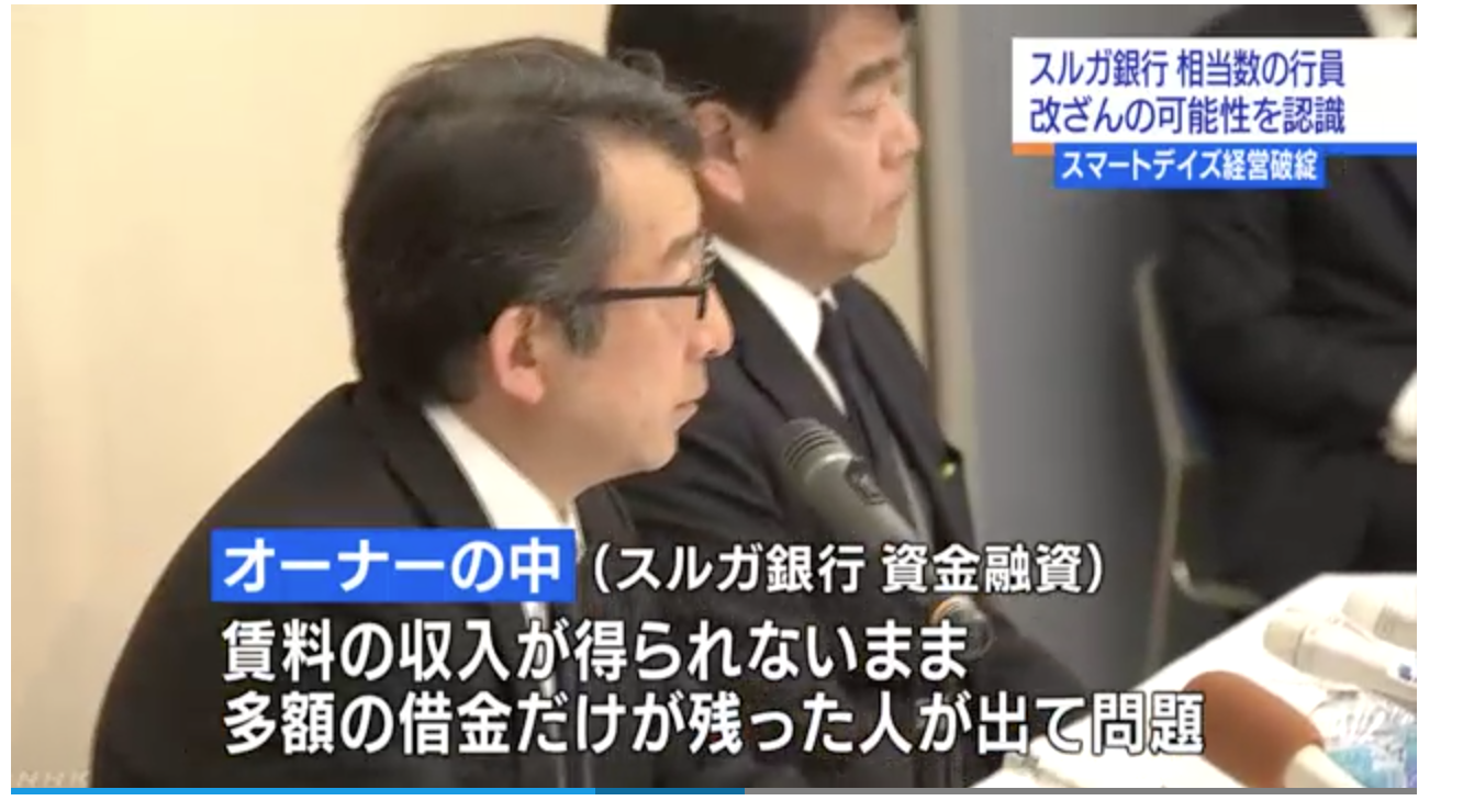 一方、スルガ銀行のことし3月期の決算は、スマートデイズの経営破綻でオーナーに対する融資の貸倒引当金を積み増したことから、最終的な利益が210億円余りと前の年度より50%余り減少し、7年ぶりの減益となりました。