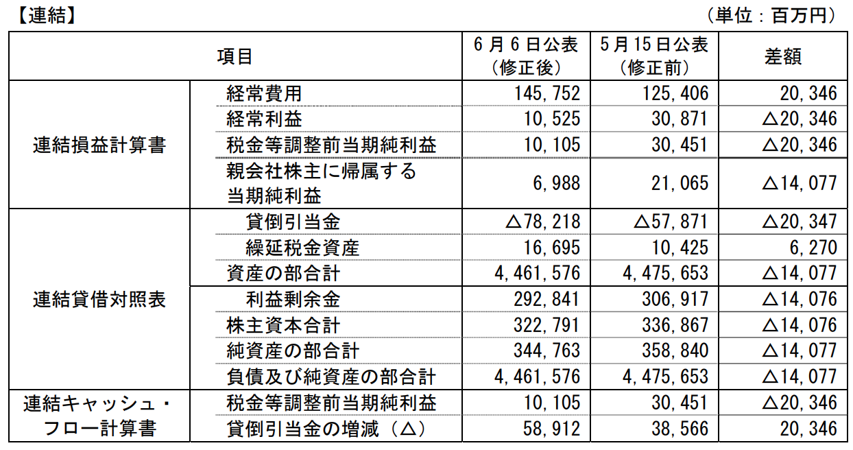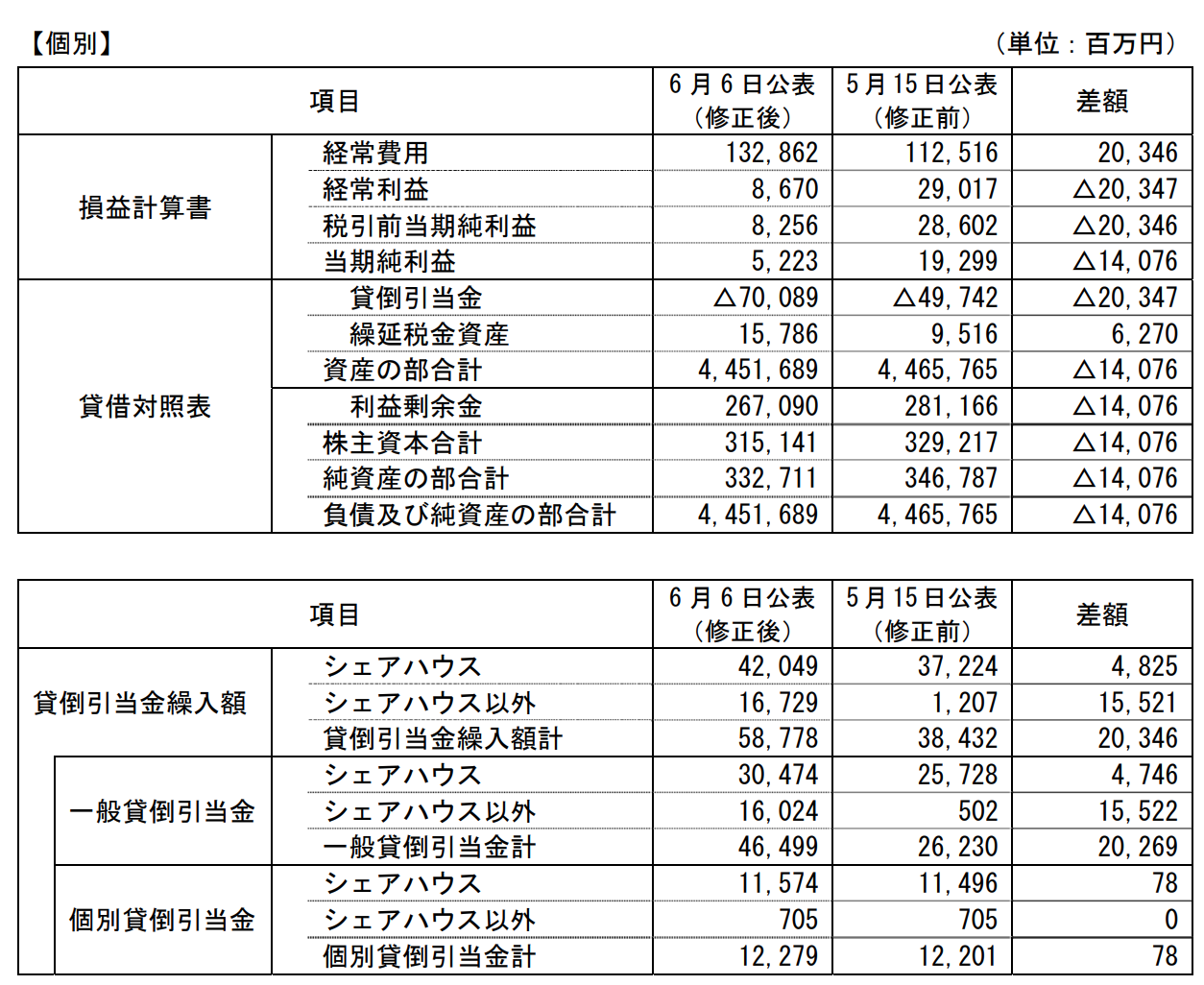 また、シェアハウス以外の投資用不動産関連融資についても、関係する不動産業者等の属性や長期サブリースなど、シェアハウスと類似のリスクの有無について慎重に検討を行い保守的に見積もった結果、貸倒引当金を約155億2,100万円追加計上することといたしました。