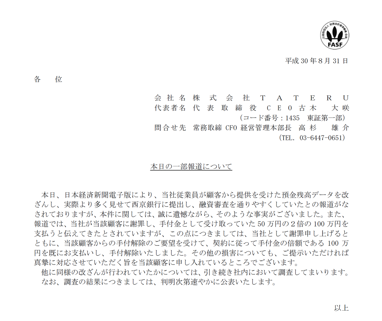 本日、日本経済新聞電子版により、当社従業員が顧客から提供を受けた預金残高データを改ざんし、実際より多く見せて西京銀行に提出し、融資審査を通りやすくしていたとの報道がなされておりますが、本件に関しては、誠に遺憾ながら、そのような事実がございました。