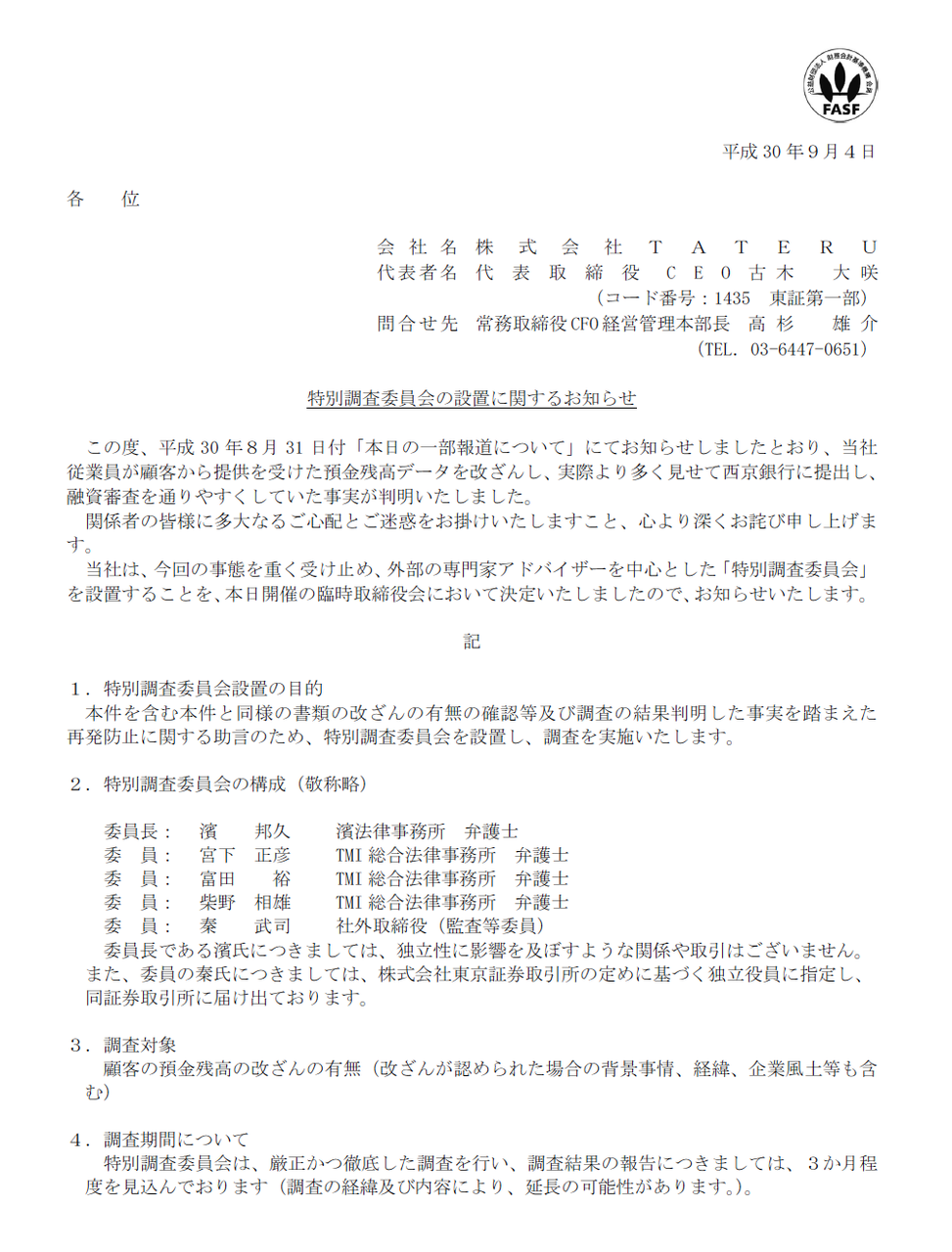 この度、平成30 年8月31 日付「本日の一部報道について」にてお知らせしましたとおり、当社従業員が顧客から提供を受けた預金残高データを改ざんし、実際より多く見せて西京銀行に提出し、融資審査を通りやすくしていた事実が判明いたしました。