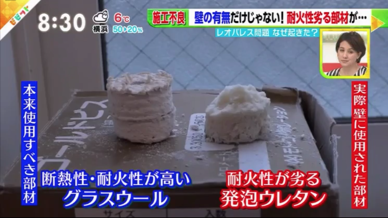 国認定の仕様では、外壁の内側に金属製の「グラスウール」という部材を設置することになっていたところ、実際は「発泡ウレタン」を使っていました。