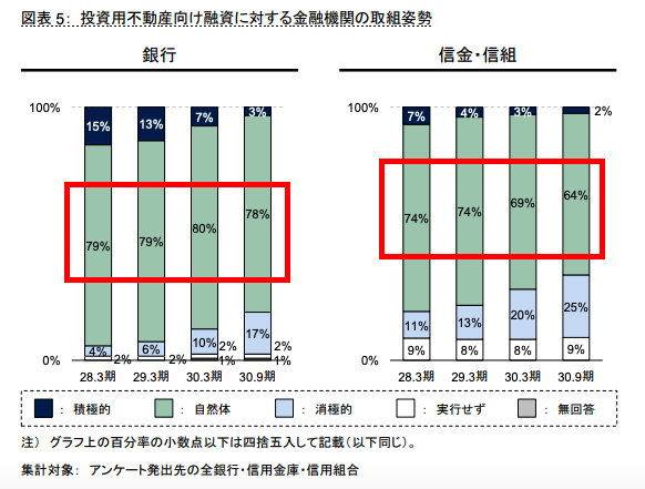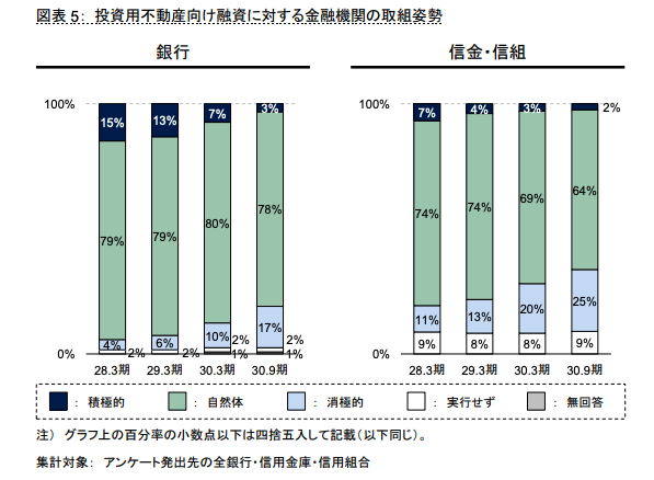 「投資用不動産向け融資への取組姿勢をみると、平成 28 年 3 月期から直近に向け、積極的に推進する金融機関は減少し、消極的な態度を取る金融機関が増加していることが見受けられる(図表 5)。」