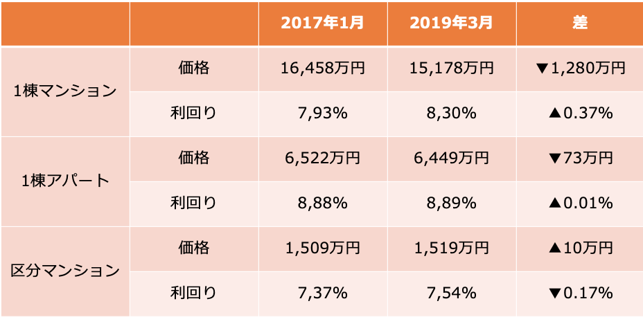 その証拠として、健美家レポートからデータを引っ張ってみると、1棟マンションが最高値を付けた2017年1月と比べてみると、如実に下落していることが分かります。