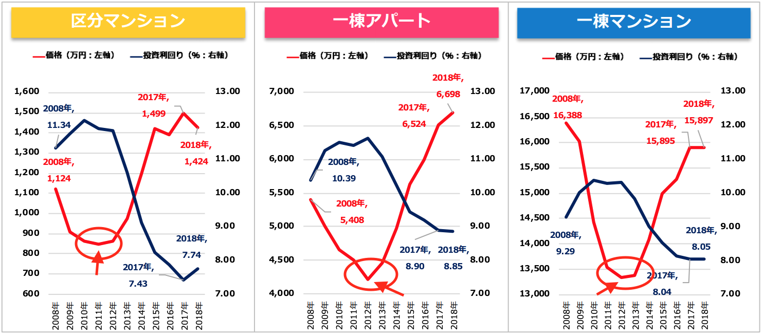 前回の記事では、2017年にピークだった物件価格が下がり始めてはいるものの、2012年ごろに底値をつけていたころに比べて、まだまだ高いということをお伝えしました。