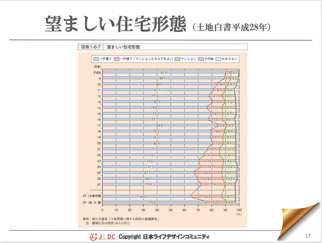平成28年の土地白書では、「望ましい住宅形態」として、「戸建て」は圧倒的な人気。
