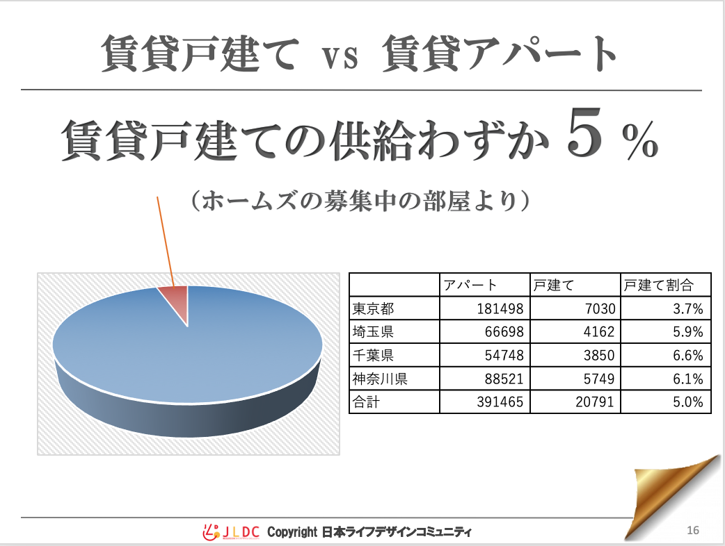 一方で、私が調べた限りでは、賃貸アパートと比べて賃貸戸建ての1都3県の供給割合は、たったの「5%」でした。