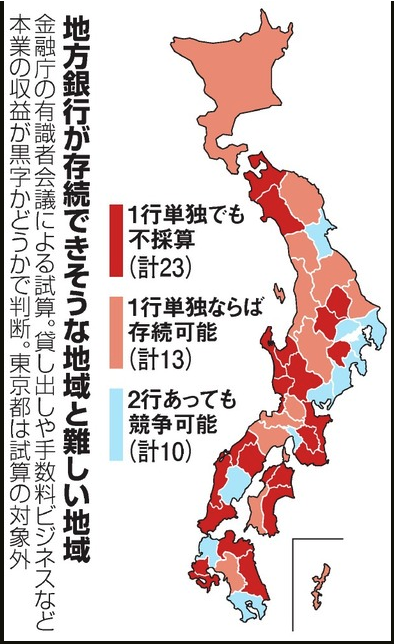 朝日新聞の記事によると、その地域にライバル銀行がなく、1つしかなかったとしても採算割れするであろう地域が全国で「23」あるとしています。
