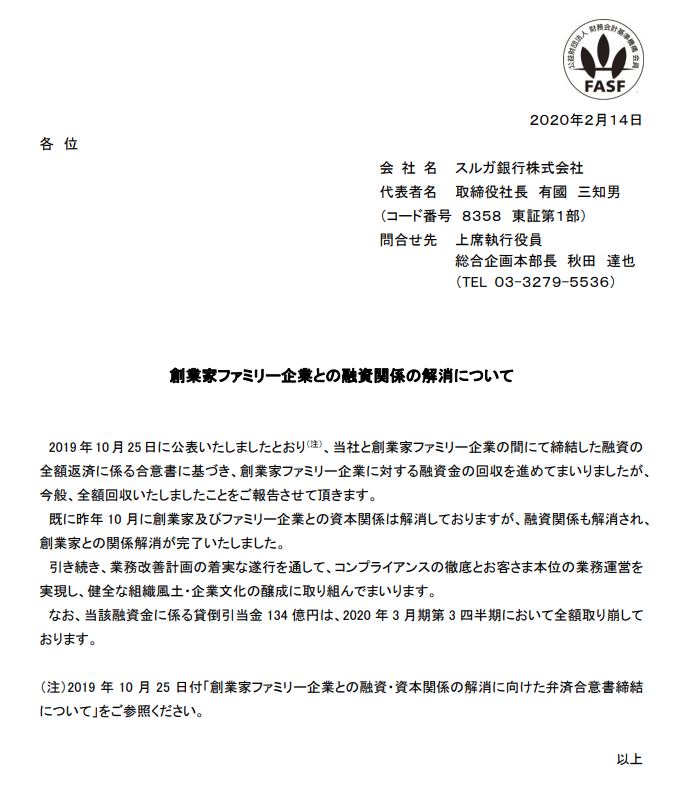 (2020年2月14日「創業家ファミリー企業との融資関係の解消について」より)