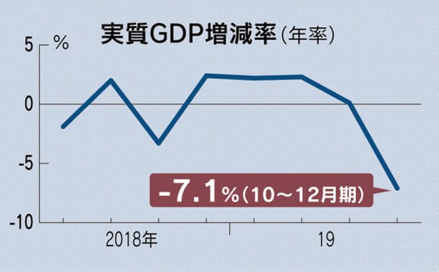 19年10~12月期GDP改定値、年率7.1%減に下方修正