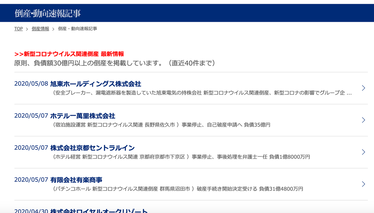 帝国データバンクのサイトには、連日のように倒産速報が流れています。
