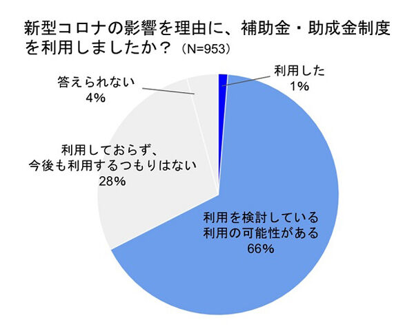 新型コロナの影響を理由に補助金・助成金制度を利用したかをたずねたところ、利用を検討している・利用の可能性があるとした企業は66%で、利用した企業は1%にとどまっている。