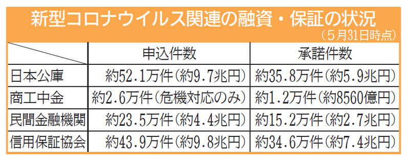政府系金融機関が5月31日までに決定した新型コロナウイルス対策の中小企業向けなどの公的融資の総額が分かった。日本政策金融公庫(日本公庫)は5月末までの約4カ月間で承諾ベースの融資額が5兆9000億円となり、リーマン・ショック後に過去最高となった2009年度の類似の融資実行額を超えた。商工中金は3―4月の2カ月間の融資実行額が、リーマン後の08年10―11月に実行した同様の融資に比べて約21倍になった。新型コロナが未曽有の資金難を招いている状況が明らかになった。