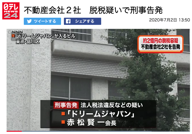 ドリームジャパンが、5.1億円の所得を隠し、約1.6億円を脱税した疑い、