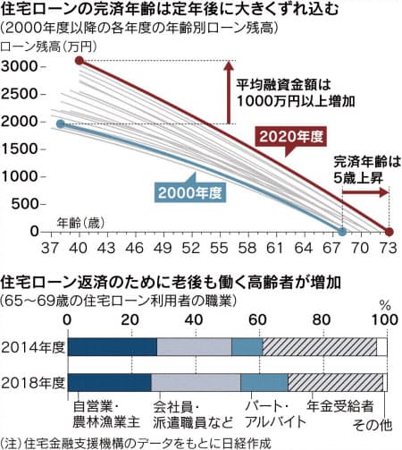 定年退職後も住宅ローンを返済し続ける高齢者が増えそうだ。日本経済新聞が住宅金融支援機構のデータを調べたところ、2020年度の利用者が完済を計画する年齢は平均73歳と、20年間で5歳上がった。借入時の年齢や金額が上昇しているためだ。70歳まで雇用が継続されても年金生活は不安定になりかねない。貸し手も借り手も老後リスクを吟味する必要がある。