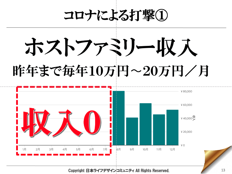 昨年まで毎年10万円~20万円/月あったホストファミリーの収入はゼロに・・・。