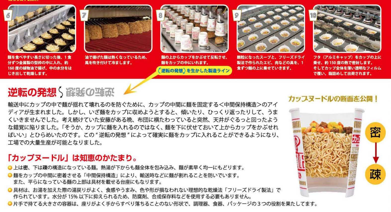 「そうか、カップに麺を入れるのではなく、麺を下に伏せておいて上からカップをかぶせればいい」とひらめいたのです。