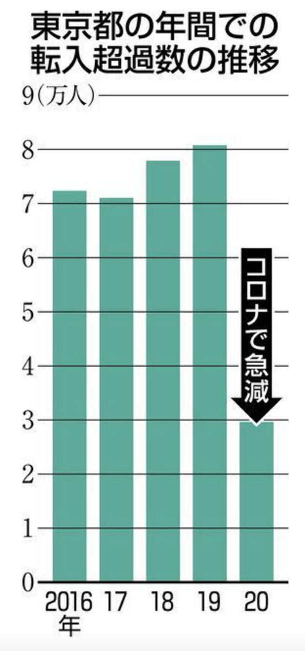 東京に移住してくる人よりも、東京都外へ移住する人の方が数が多くなる「転出超過」という状況に、集計依頼初めて陥っているのです。