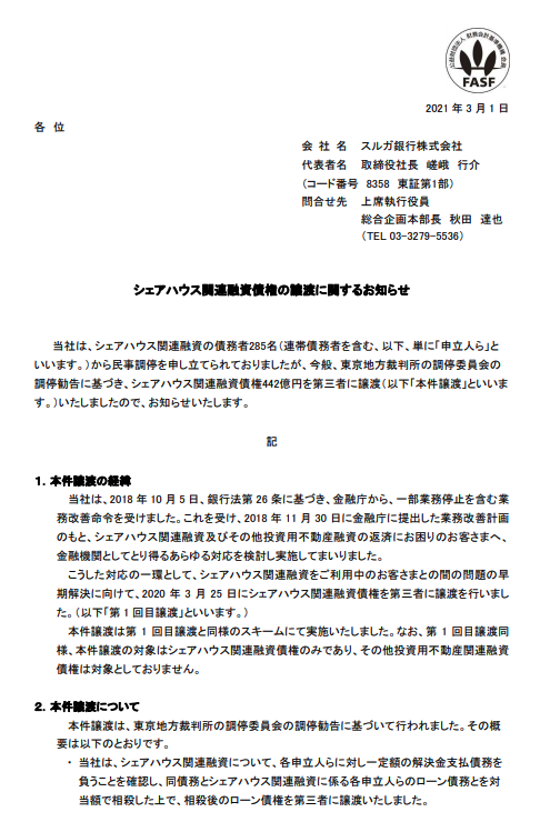 (3月1日スルガ銀行「シェアハウス関連融資債権の譲渡に関するお知らせ」より)