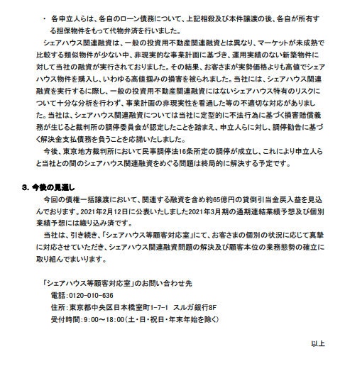 「シェアハウス関連融資は、一般の投資用不動産関連融資とは異なり、マーケットが未成熟で比較する類似物件が少ない中、非現実的な事業計画に基づき、運用実績のない新築物件に対して当社の融資が実行されておりました。その結果、お客さまが実勢価格よりも高値でシェアハウス物件を購入し、いわゆる高値掴みの損害を被られました。当社には、シェアハウス関連融資を実行するに際し、一般の投資用不動産関連融資にはないシェアハウス特有のリスクについて十分な分析を行わず、事業計画の非現実性を看過した等の不適切な対応がありました。」