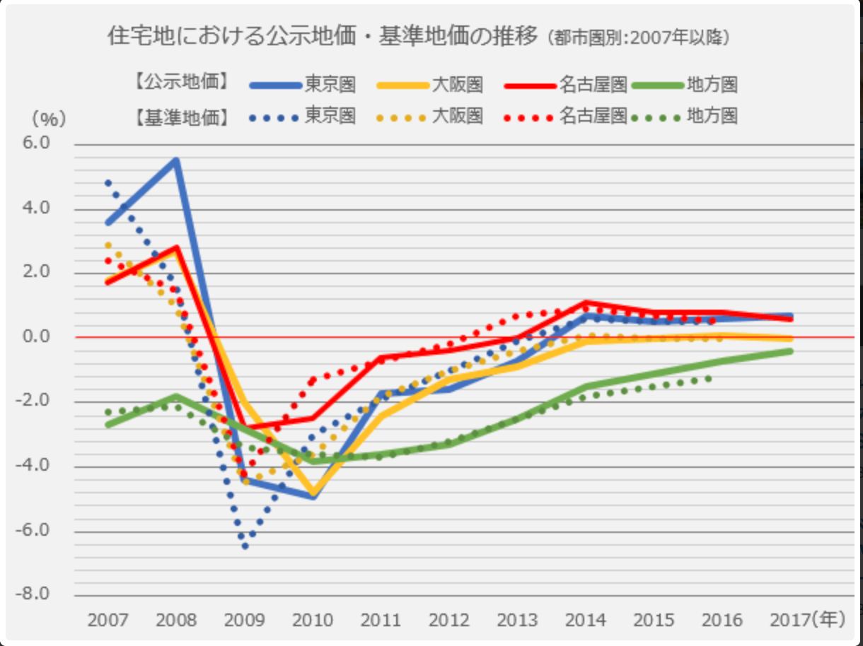つまり、ここ7年でいうと、都心部の土地は安定しており、上昇していると言えます。