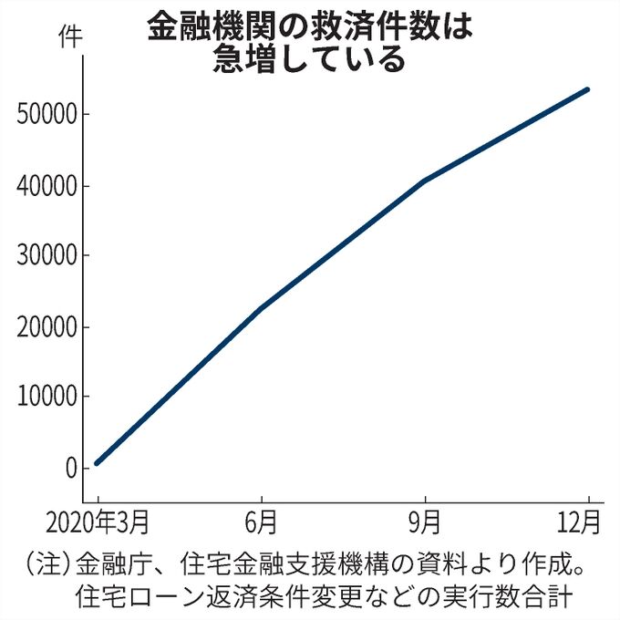 コロナ禍で住宅ローン返済が難しくなり、金融機関の救済を受けた人は2020年3~12月累計で5万人を超える。個人債務問題に詳しい亀山元・弁護士は「単純比較はできないが、東日本大震災の被災3県(岩手、宮城、福島)の銀行などでの住宅ローンの救済件数は発生後3年強で1万件程度。コロナの影響の大きさがうかがわれる」。