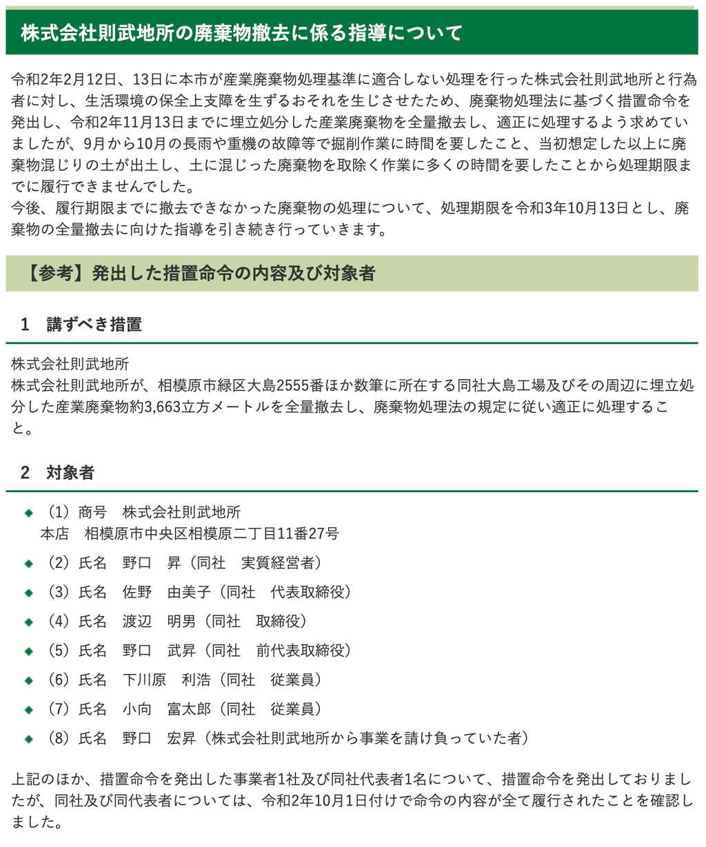 (株式会社則武地所の廃棄物撤去に係る指導について)