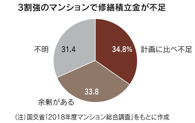 深刻なのは長期計画で見込んだ修繕積立金の金額も確保していないマンションが少なくないこと。国交省の調査で、積立金が計画に比べ「不足している」と回答した割合は3割強あった。